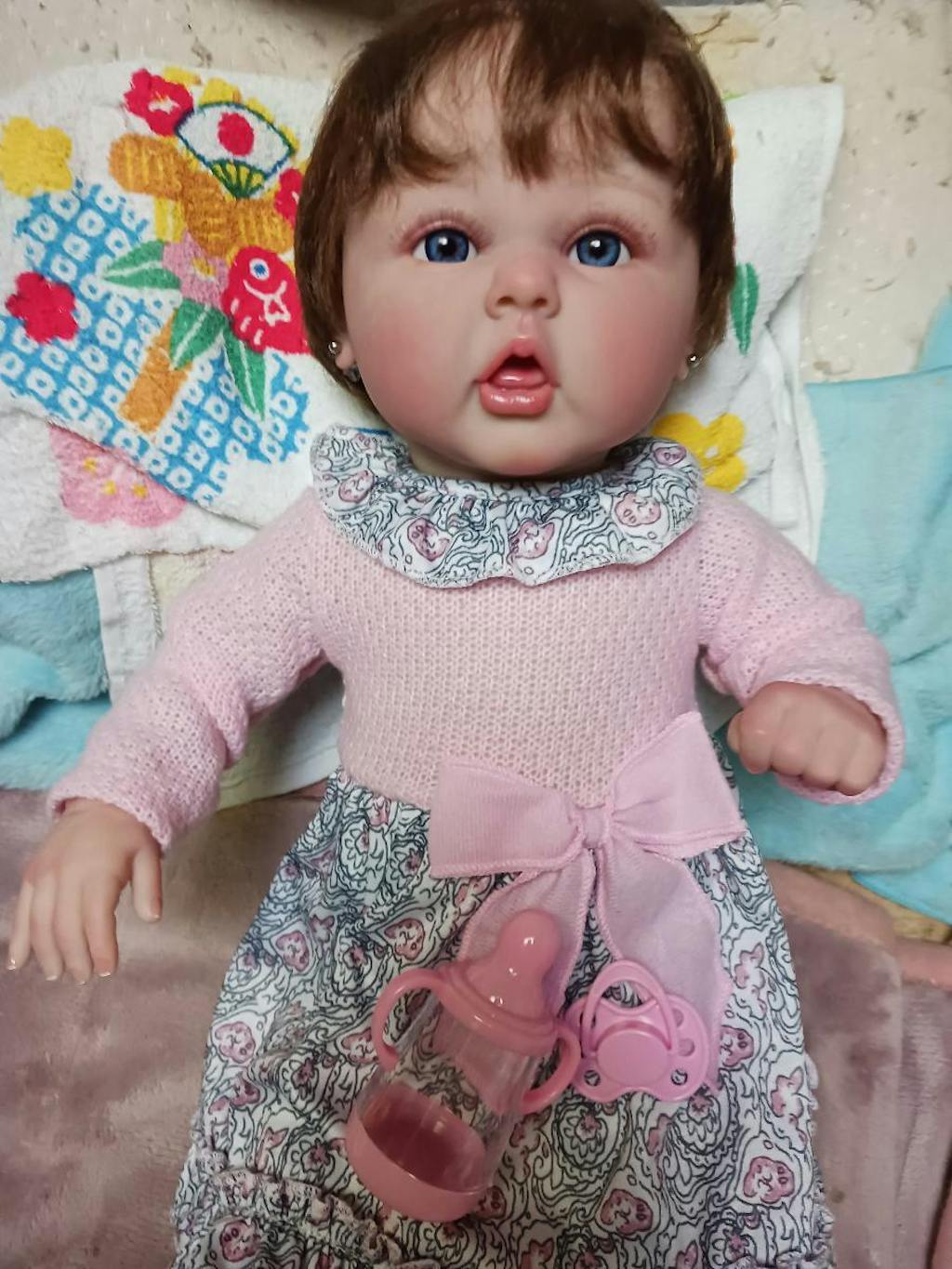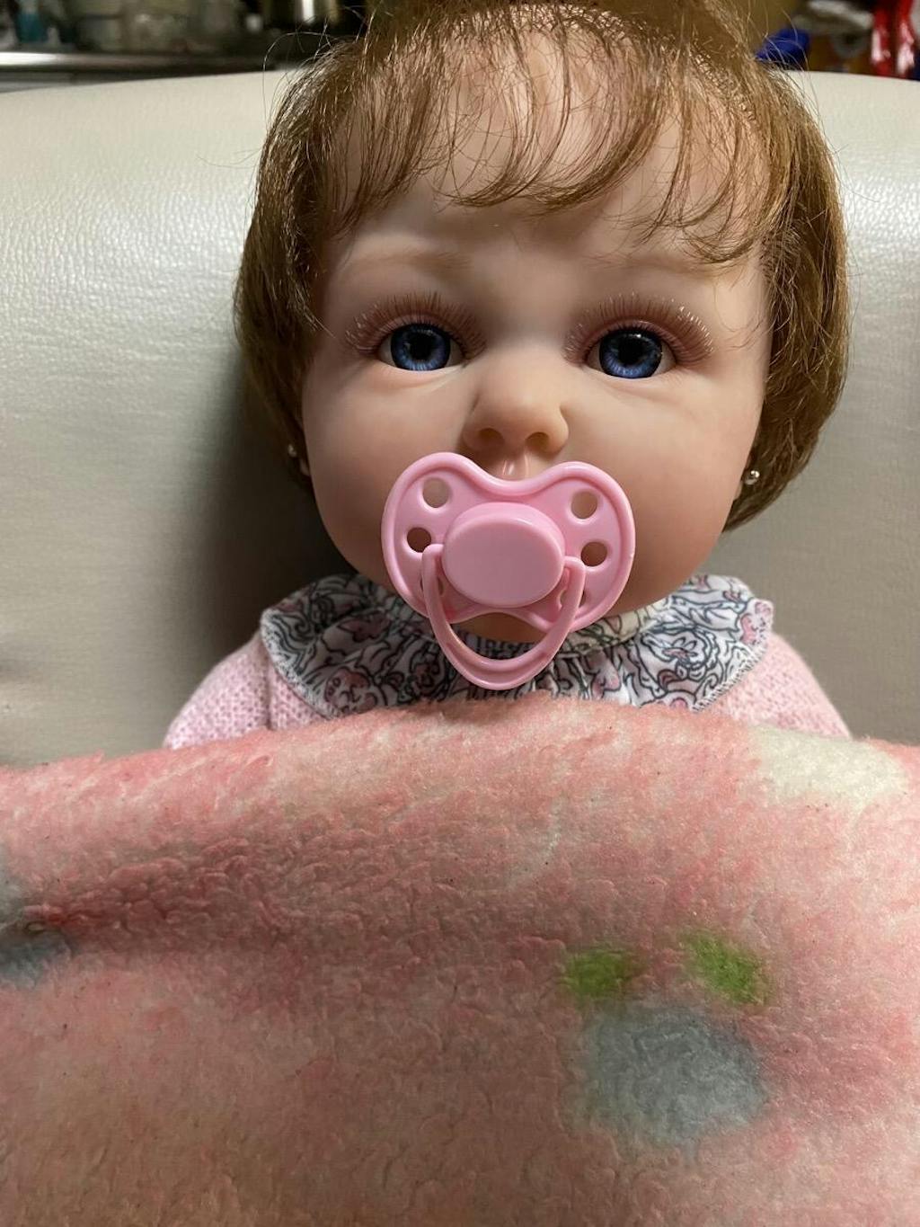 Baby Identification Height: 20/24 inches Weight: 1.4kg/1.8kg Hair: Hand-rooted hair Eyes: Open eyes Eyebrow: 100% pure hand drawn Nails: 100% hand drawn nails, pink nail bed, translucent nails Scent: A delicate baby powder scent. Drinking and Wetting: No