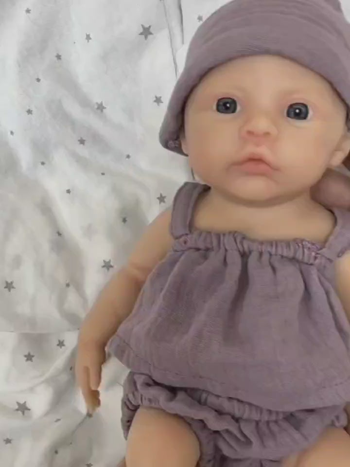 Neonata rinata in silicone morbido da 30 cm con occhi azzurri e vestiti viola - Meadow